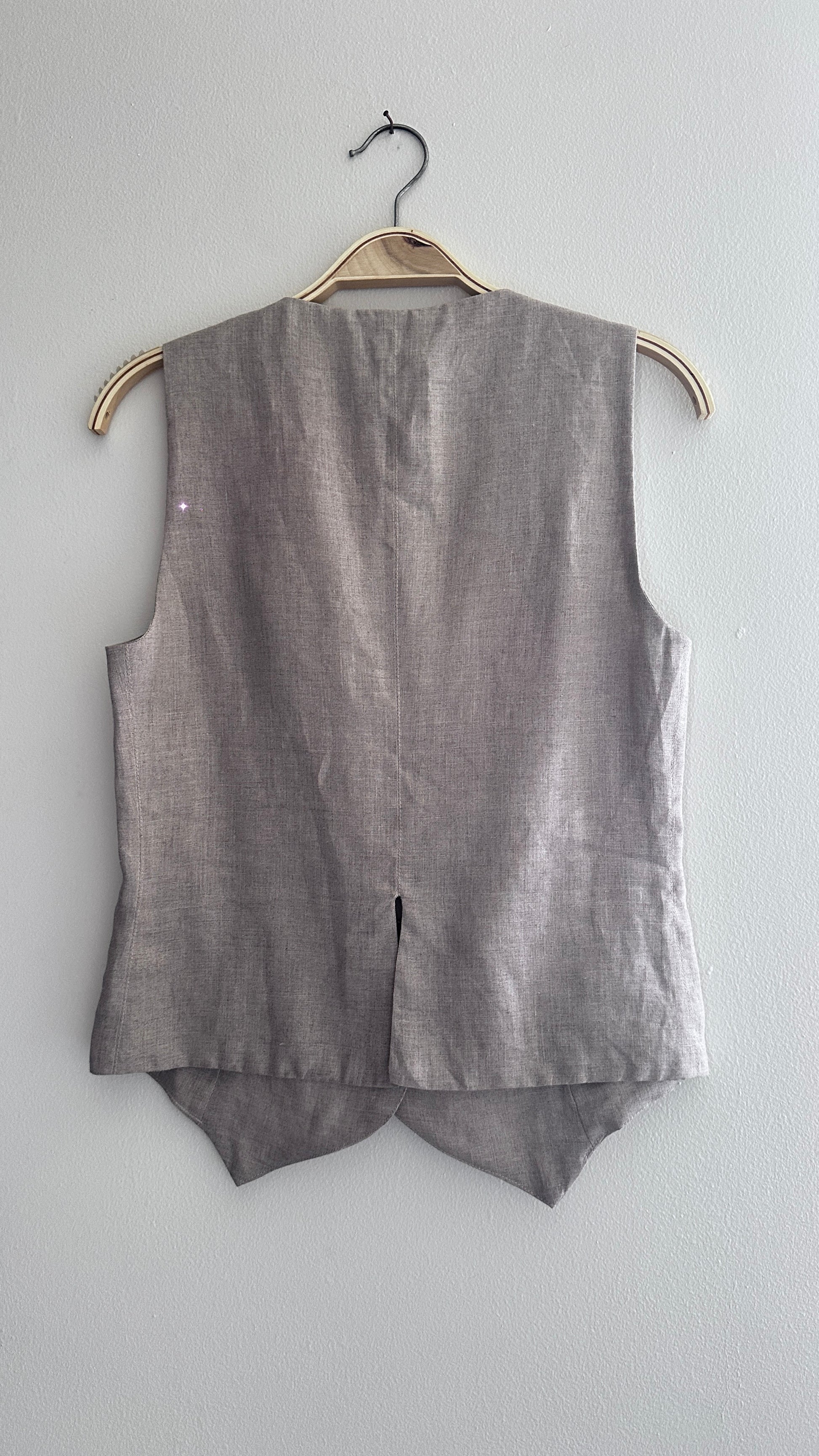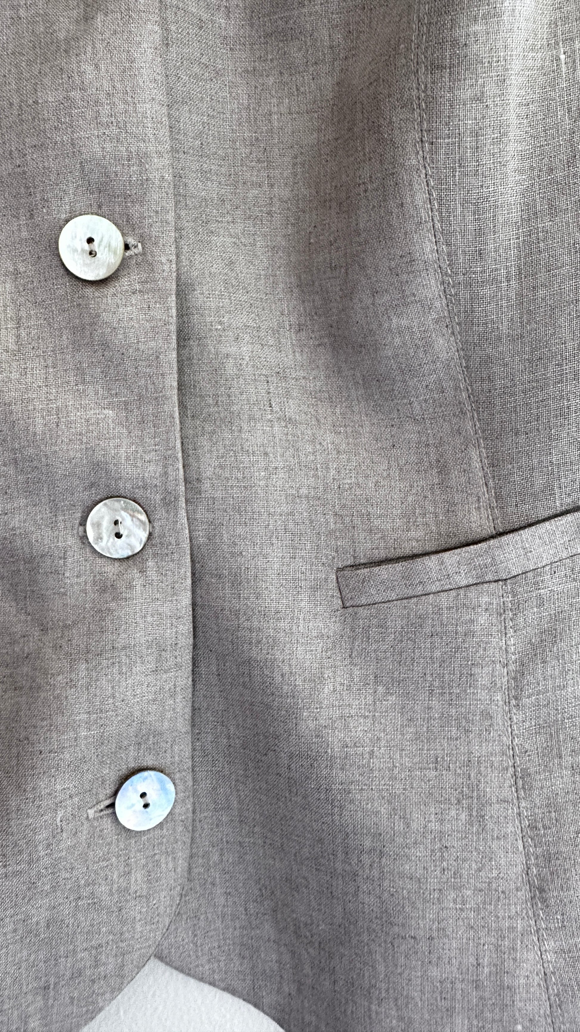 Our refined tailored vest, crafted from pure Italian linen has a structured fit, elegant V-neckline, and three-button closure, it offers a sophisticated layer for both casual and formal looks.